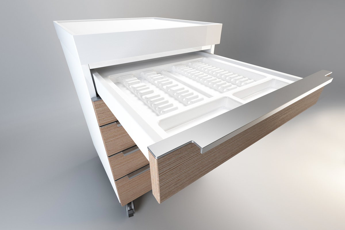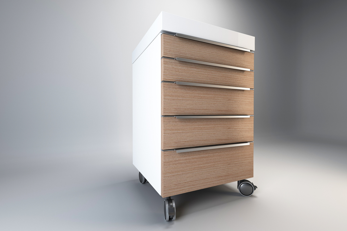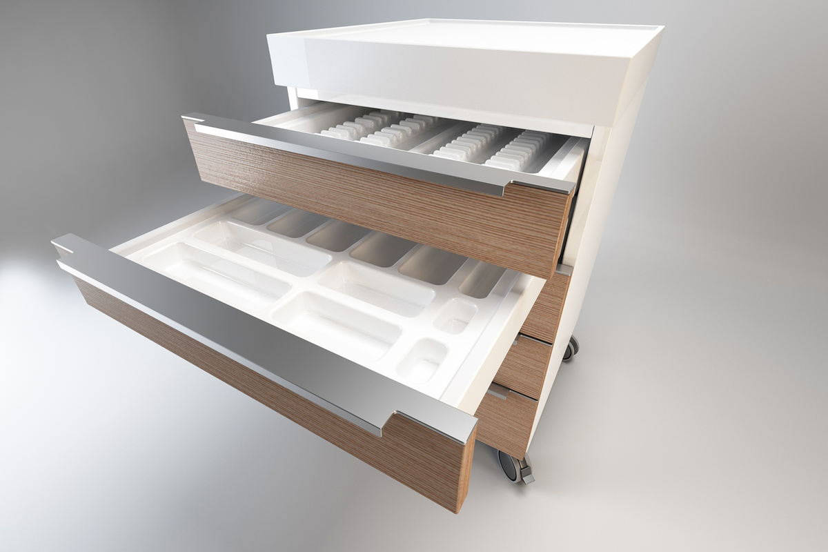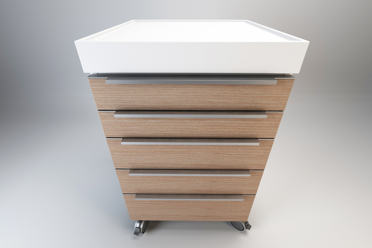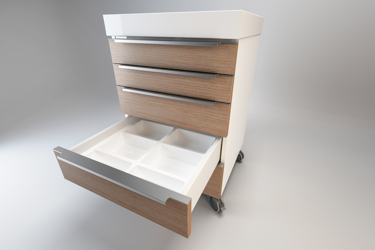 Mobile assistant furniture with board dimensions 50 x 50 cm. Work surface is made from mineral stone (solid), 20 - 70 mm thick and with elevated edge. Elevated edge of the board is intended for manipulation with the assistant furniture. The height of mobile assistant furniture TECH is 80 - 85 cm (according to the height of the board). Wheels TENTE provide smooth manupulation and can be locked in any position. Design of mobile assistant furniture TECH is either in gently grained pastel surface, woodgrain, or in high gloss surface.