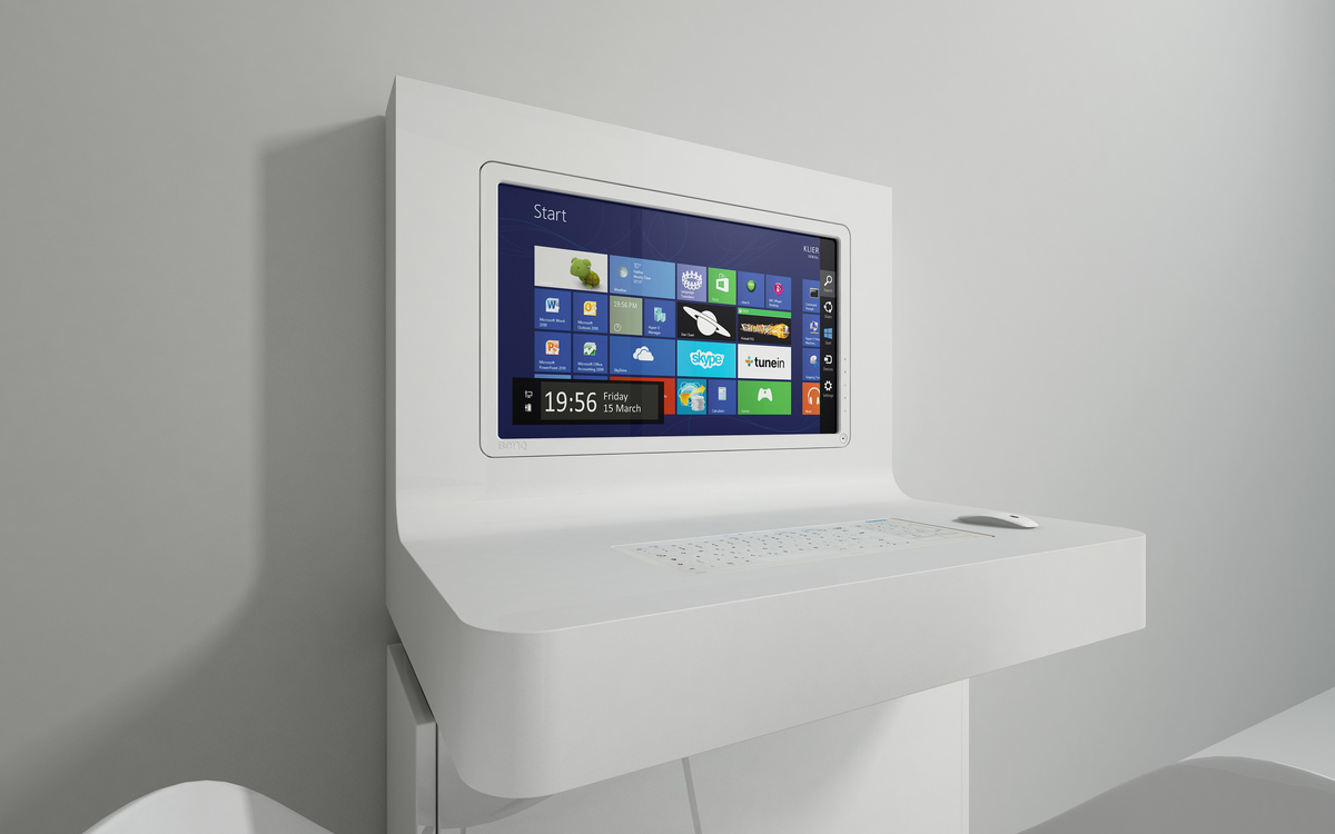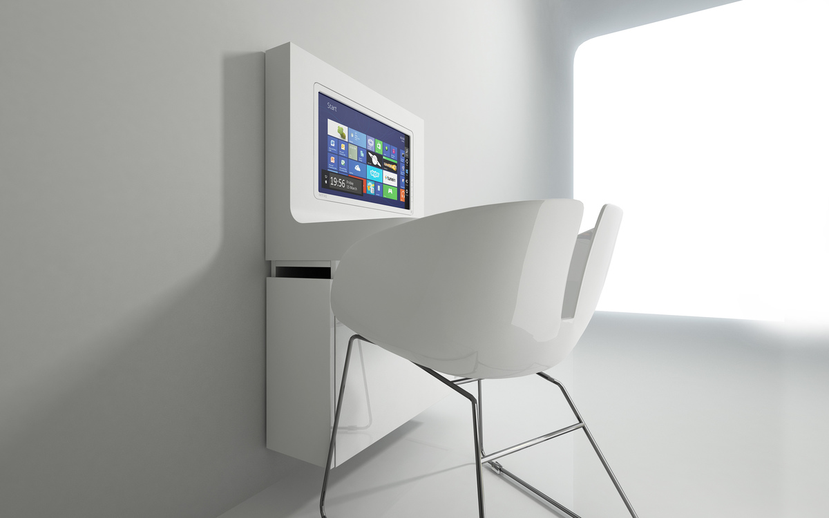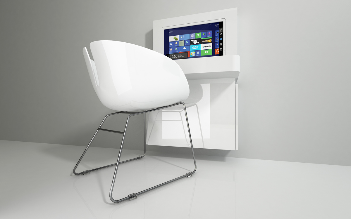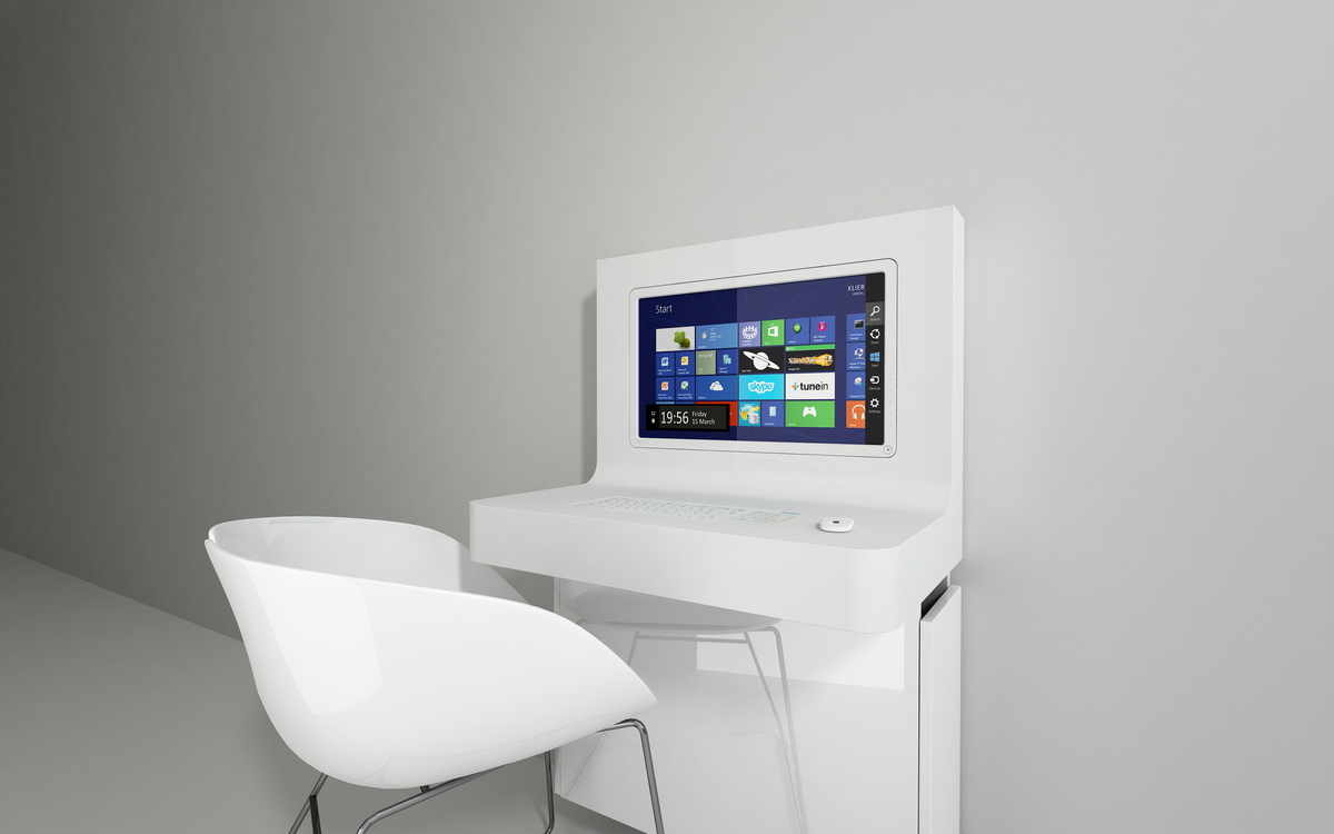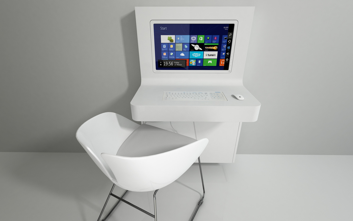 PENDANT PC TABLE MADE OF MINERAL STONE POLYSTON, WITH INTEGRATED MONITOR, ANTI-BACTERIAL KEYBOARD CLEANKEYS AND PC OF MID TOWER SIZE THE TABLE IS DESIGNED FOR SITTING STAFF
