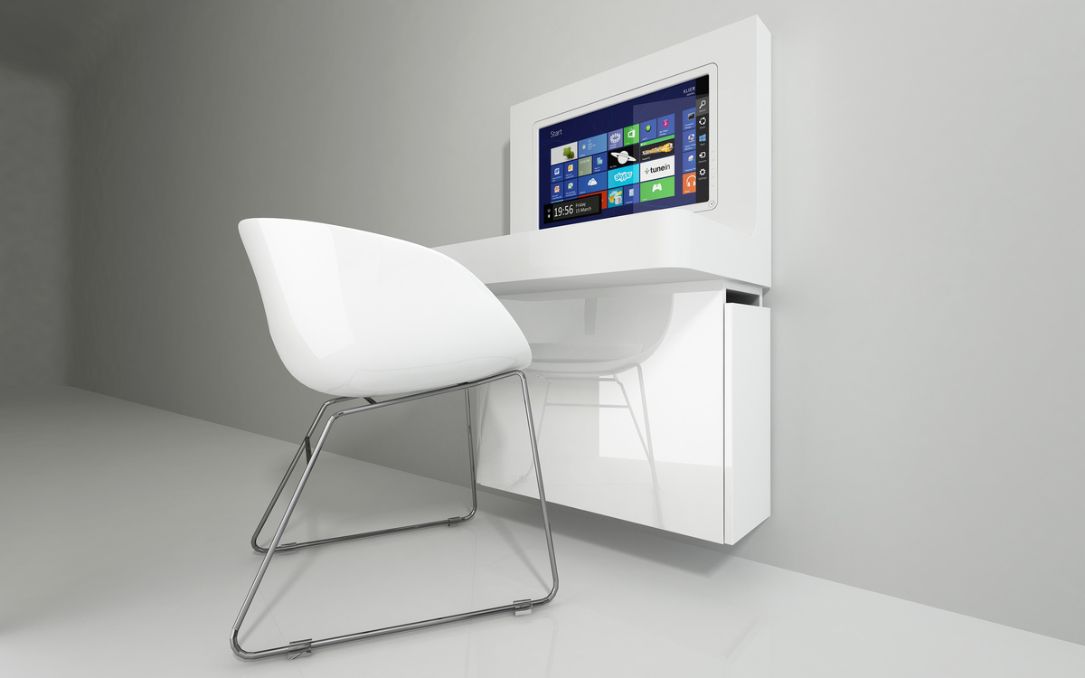 The height of work surface of PC POINT-C is 75 cm after being suspended on the wall at the height of 10 cm from the floor, and the desk is intended for a sitting person (the height can be increased when you suspend the desk higher on the wall).