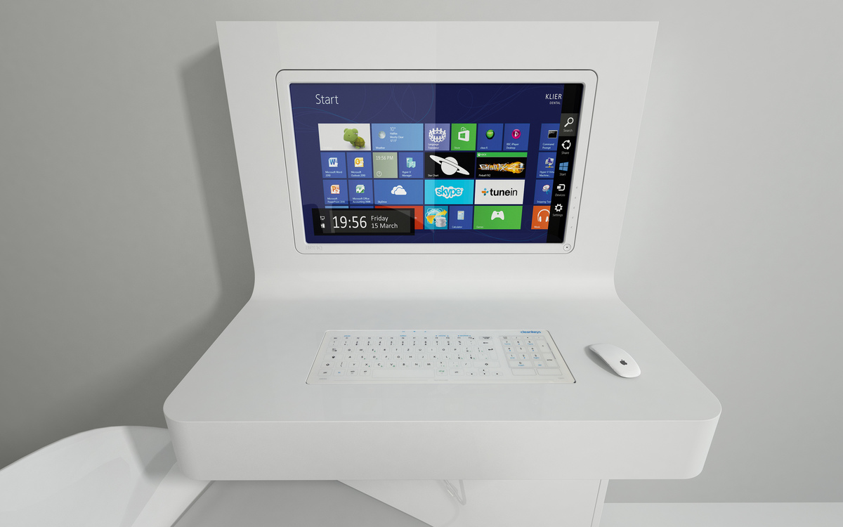 In the body of PC POINT-C, there are built-in a glass antibacterial keyboard Cleankeys and 24" screen.